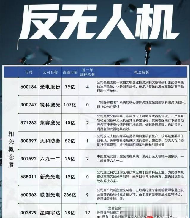 三、反无人机概念股梳理在军事领域,无人机凭借其隐蔽性强、机动性高、成本低等优势,逐渐成为现代战争中的重要作战力量,各类无人机对防空体系构成了极大挑战。