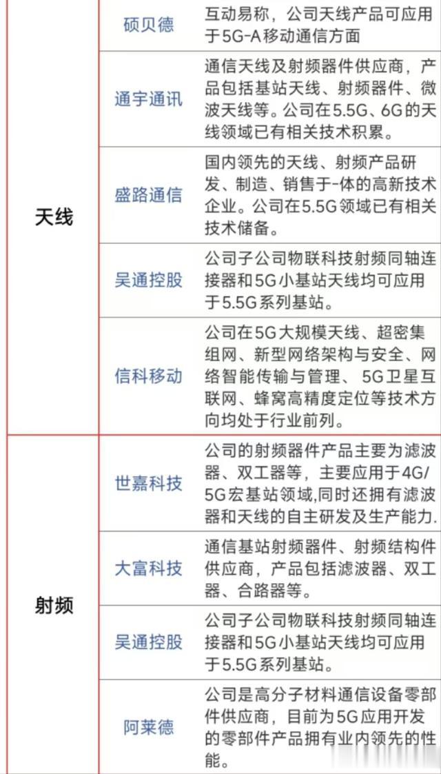二、5G-A概念股梳理所谓的5G-A,即5G-Advanced,作为5G的增强版本,也被称为5.5G,是通信技术发展历程中的又一重要里程碑。它继承了5G的诸多优势,并且在此基础上实现了关键技术的重大突破,在网速方面5G-A的下行峰值速率可达10Gbps,是5G初期千兆速率的10倍,从千兆提升到万兆。
