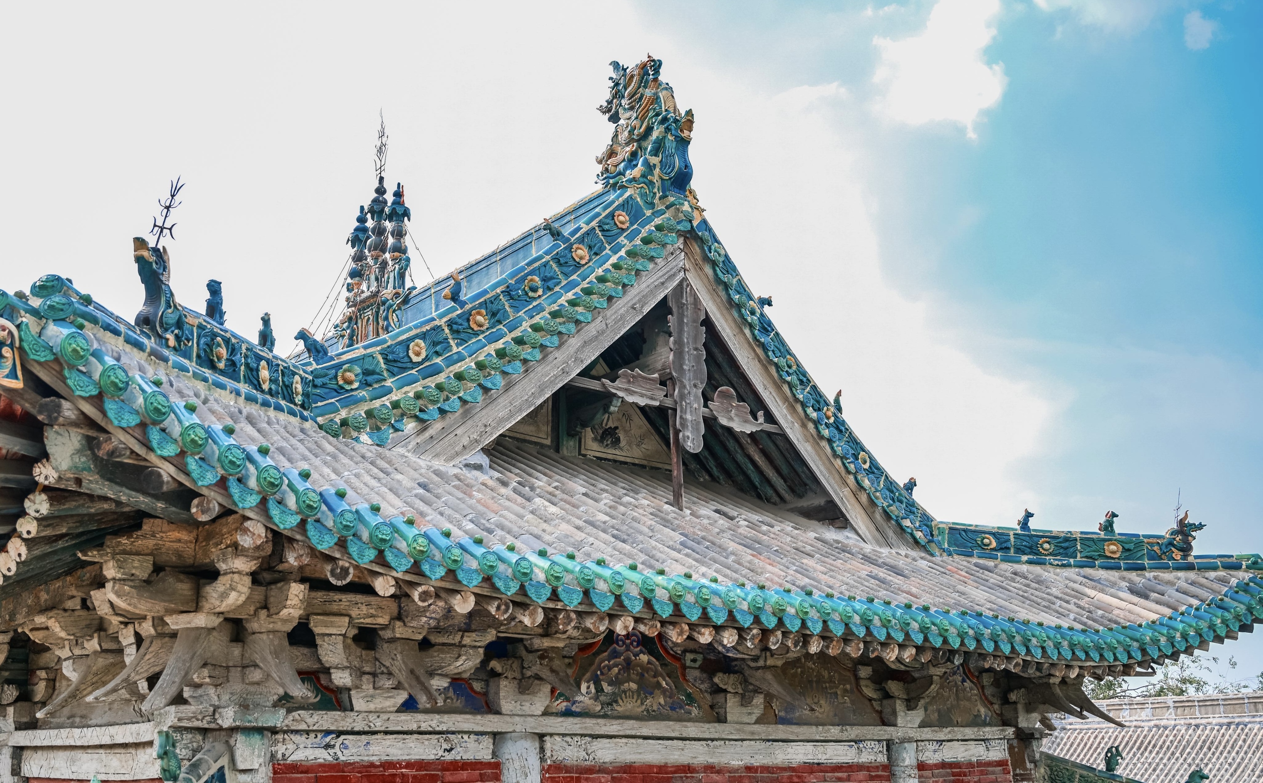 小靳东岳庙的献亭,无疑是整个庙宇最璀璨的存在。初见它的瞬间,我便被其无与伦比的精美所震撼,心中涌起一股强烈的冲动,仿佛能盯着它看一万年都不会厌倦。这座献亭为清代遗构,四面敞朗,给人一种通透开阔之感。它面阔三间、进深五椽,单檐歇山卷棚顶的设计,宛如一只展翅欲飞的鲲鹏,灵动而又大气。更为惊艳的是,黄、绿琉璃的装饰,在阳光的照耀下熠熠生辉,如同给献亭披上了一件华丽的霓裳。