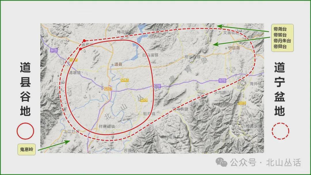 海内北经的“帝尧台、帝喾台、帝丹朱台、帝舜台”,位于道县谷地的东面。这四种台都是祭祀之台。祭祀西王母的鬼崽岭,则位于道县谷地的西南。