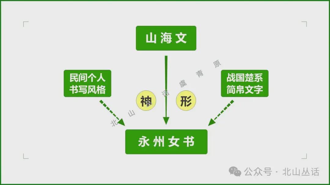女书源自山海文。女书的神,来自山海文的简洁风骨;女书的形,在战国时期受楚系简帛文字影响较多。