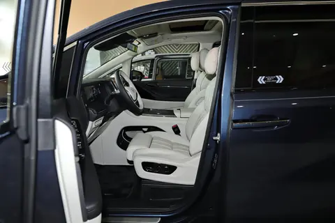 车身侧面是典型的MPV姿态,5251mm的长度让它看起来很修长,但1893mm的宽度又不会给停车带来太多压力。隐藏式滑轨是个好设计,关门后完全看不到轨道,车身侧面像被熨过一样平整,跑高速时风噪似乎都小了些。双侧电动侧滑门的开启速度可以调节,调至“缓速”模式时,老人孩子上下车更安全;调至“快捷”模式,商务接待时开门关门干脆利落,不会让人等太久。车尾的贯穿式尾灯里有128颗LED灯珠,刹车时会从中间向两侧渐亮,像流水一样,后车更容易察觉前车减速,安全性挺高。 坐进车内,首先被“淡墨千山”的内饰主题打动。北美百年原木面板不是那种光亮的抛光款,而是带着细微的木纹肌理,摸上去有点像触摸老家具的质感,商务接待时显档次,家庭使用时也不会怕孩子刮花。中控台的线条是流畅的曲线,从仪表台一直延伸到车门,像山涧的流水,没有锋利的棱角,孩子在车内跑动也不容易撞到。