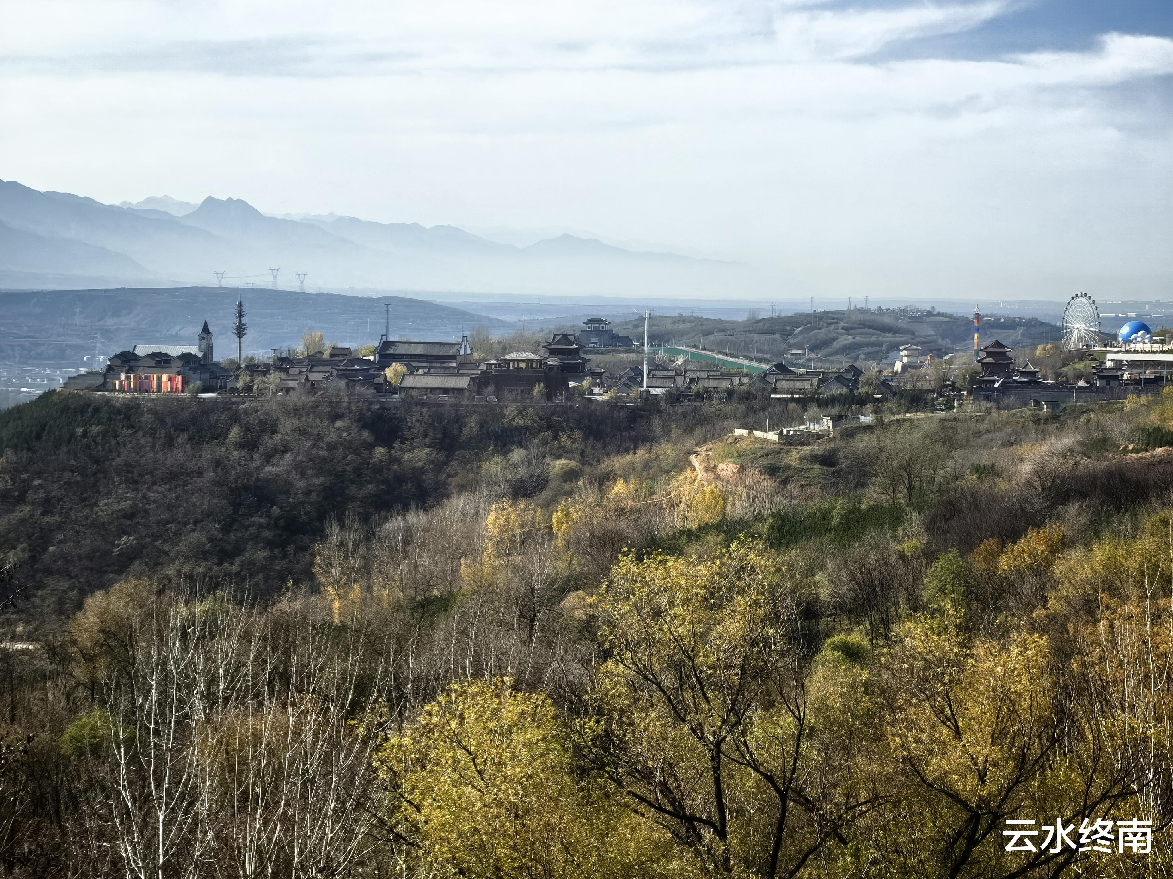 环山路如一条游龙从西往东而来,上面白鹿原头影视城的建筑历历在目,再远处,就是隐隐青山。