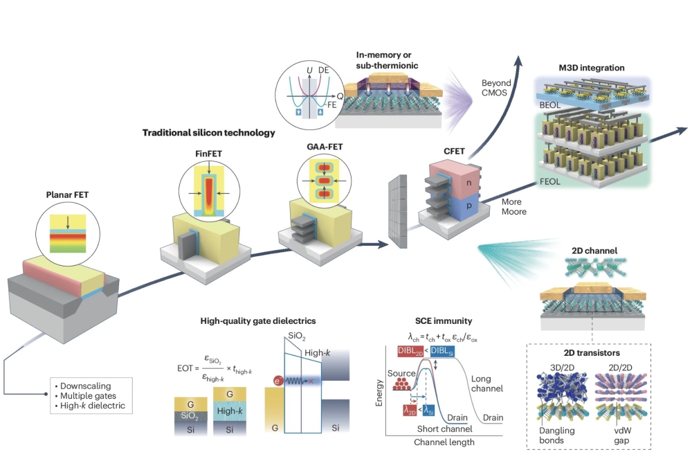 数十年来,互补金属氧化物半导体(CMOS)技术有力地推动了性能提升与集成密度增长。然而,进一步的技术缩放正日益受到物理和静电限制的掣肘。二维半导体作为一种“超越硅”的解决方案,正吸引着与日俱增的关注目光。诸如三星电子、台积电、英特尔、艾梅克(Imec)等芯片企业及研究机构,已将二维半导体晶体管纳入2030年代中期以后的下一代技术发展蓝图。