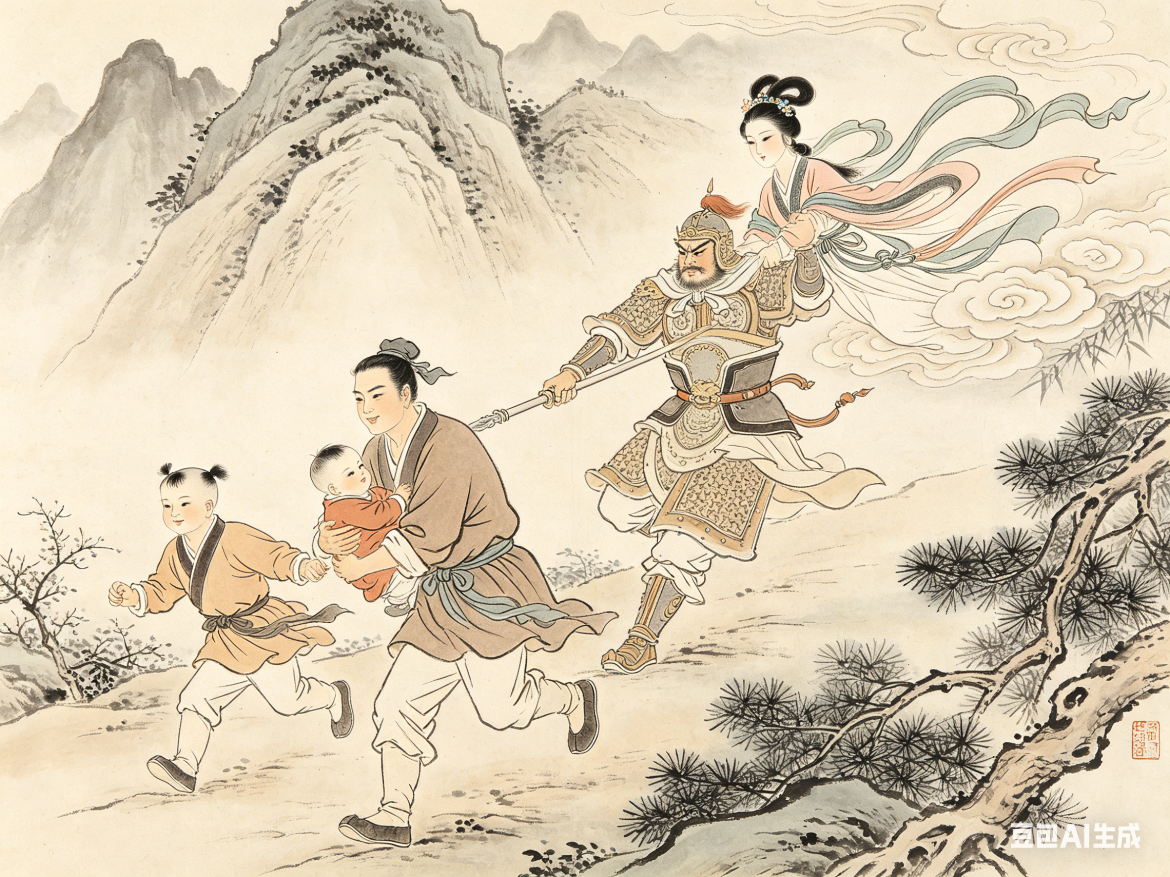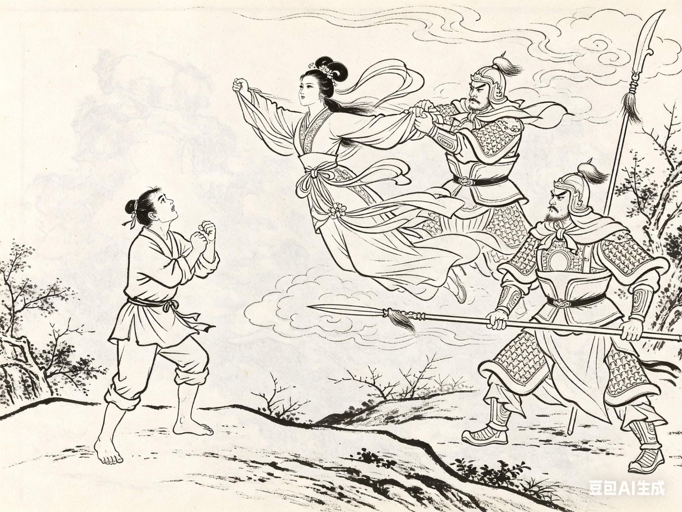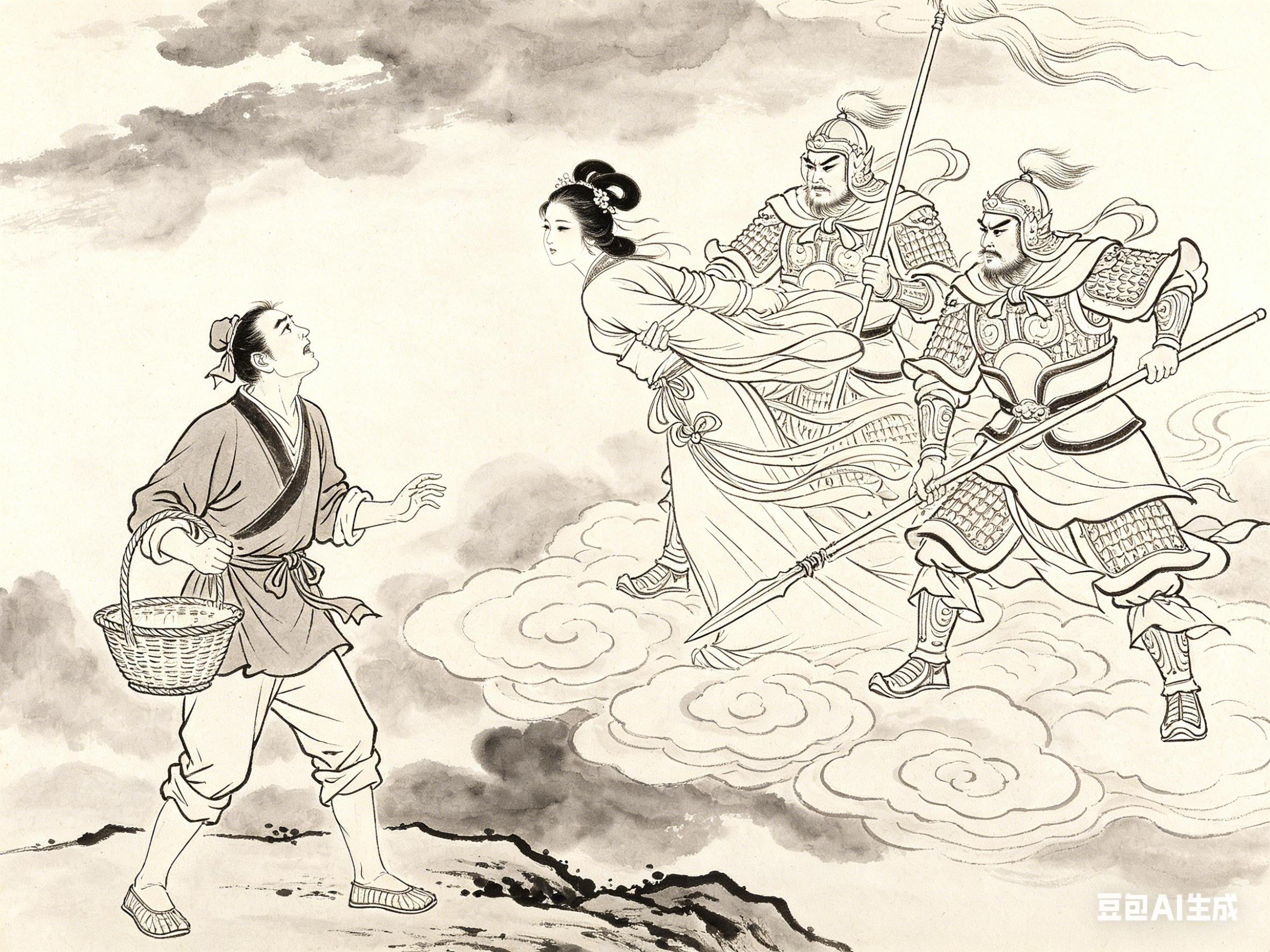 好景不长,玉皇大帝得知织女私自下凡与凡人成亲,十分震怒,派王母娘娘押解织女回天庭受审。老牛不忍心看着牛郎妻离子散,便触断头上的角,变成小船,让牛郎挑着一双儿女乘船追赶织女。