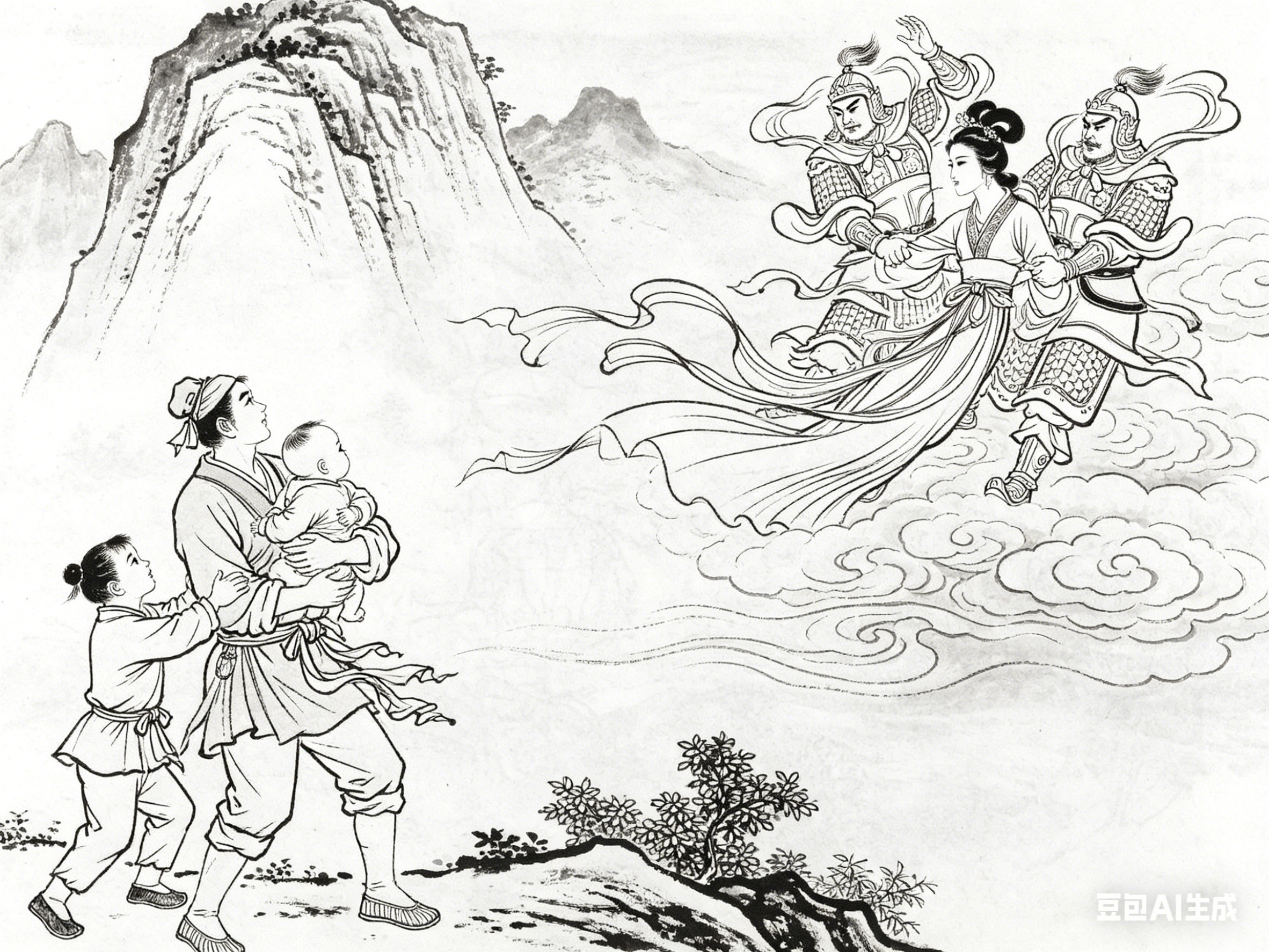 眼看牛郎即将追上织女,王母娘娘拔下头上金钗,在天空中划出一条波涛滚滚的银河,将牛郎与织女隔在两岸。牛郎无法过河,只能挑着儿女,在河边与织女遥望对泣场面凄惨。