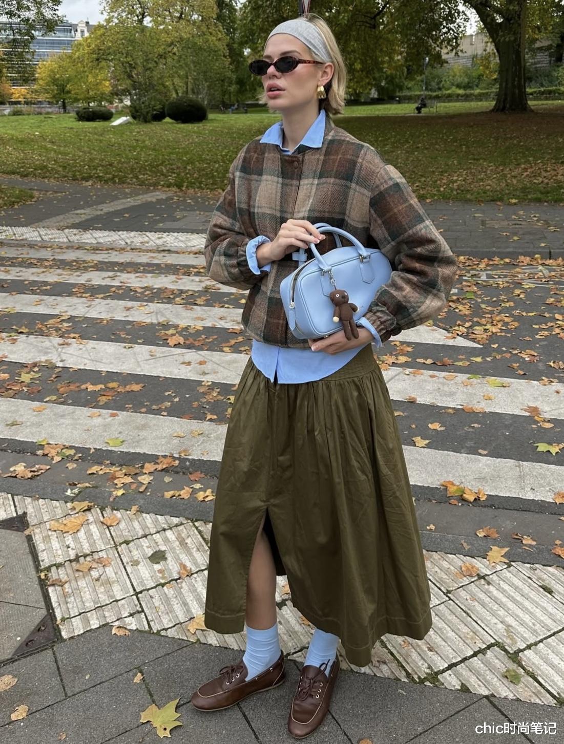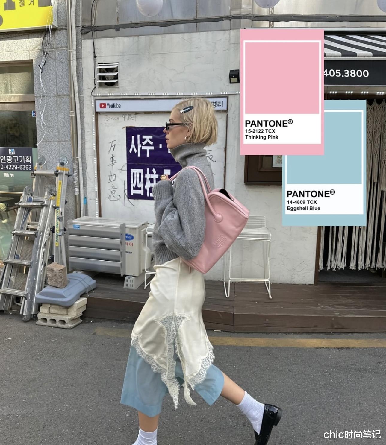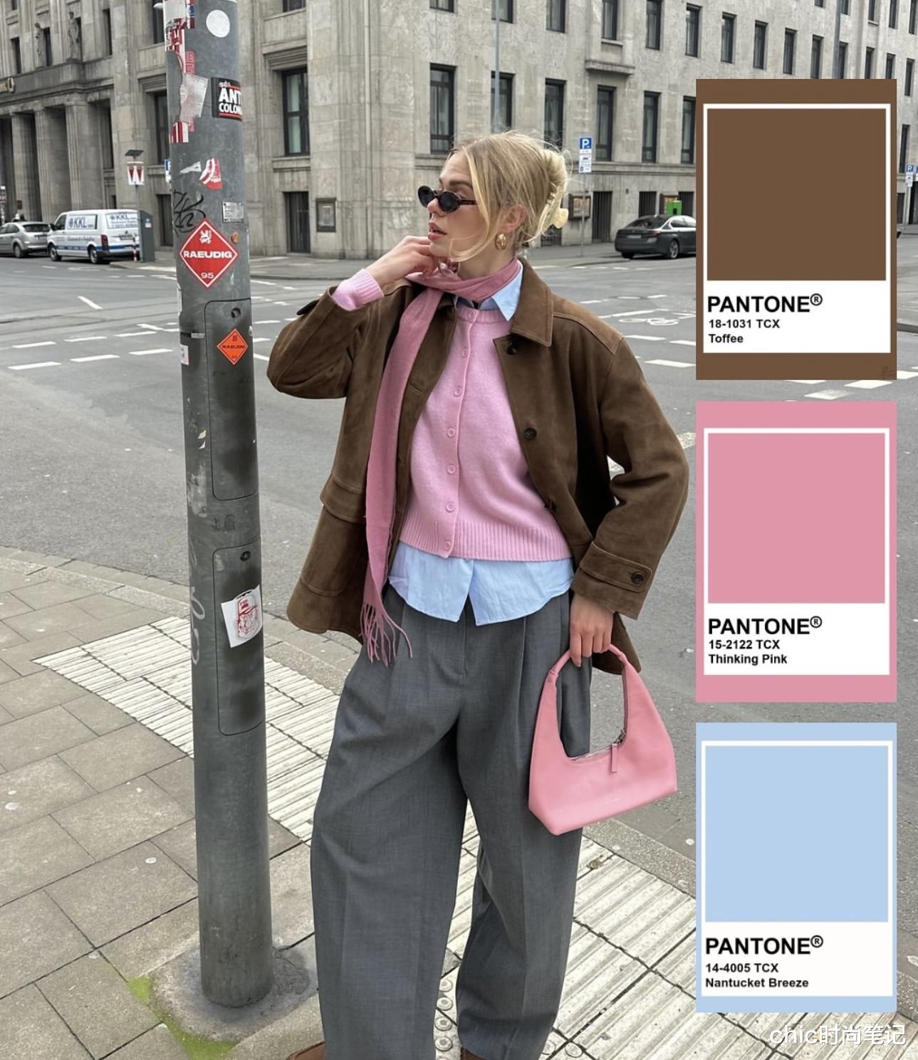 在浅粉和浅蓝的色系上叠加棕色,直接把春夏氛围感的穿搭变成了秋冬穿搭。大地色系就是有很大的包容感,简约而高级。