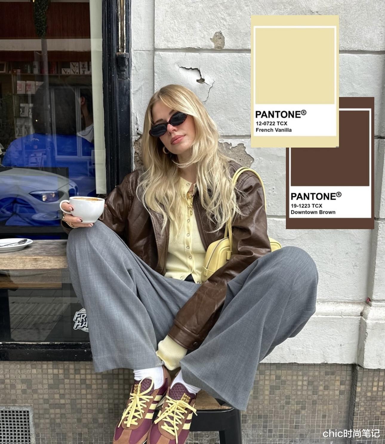 棕色是秋冬季节必备色系,与之相搭配的不仅是姜黄,鹅黄也非常合适,都是黄色系的衍生,一般以鹅黄色作为内搭或者打底,配以棕色外套或者裤子即可,轻松打造时尚。