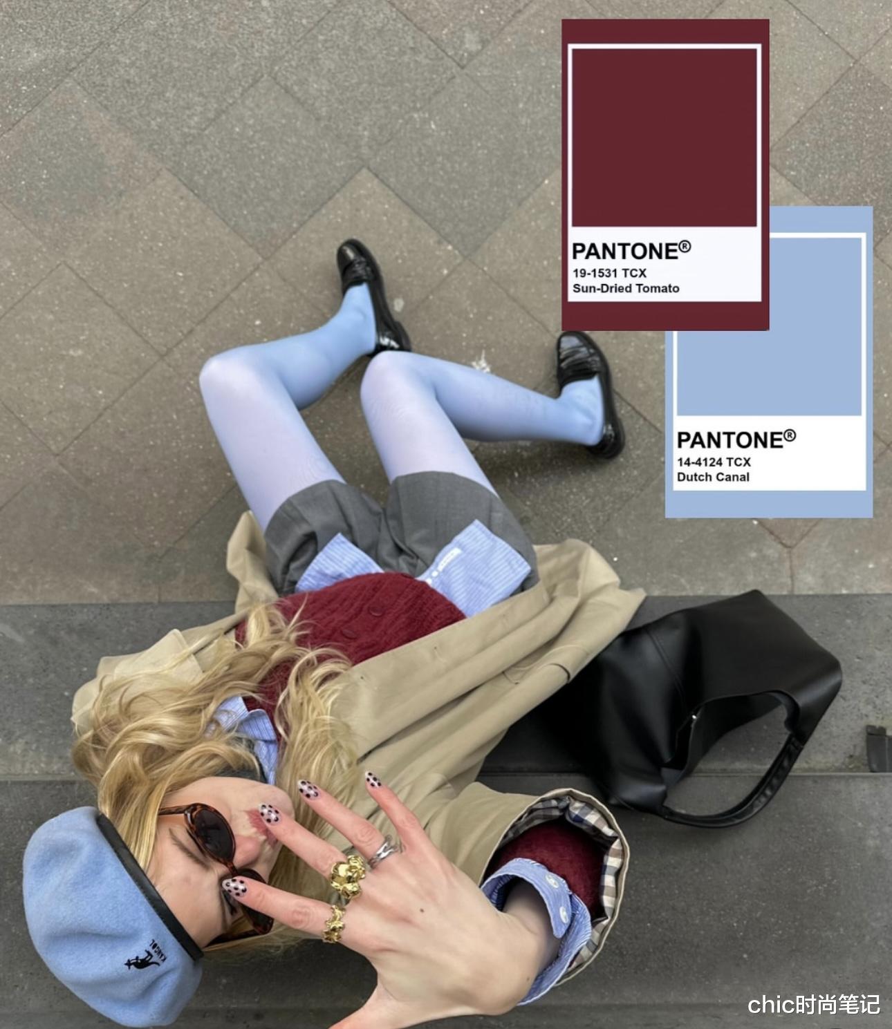 波尔多红色是适合秋冬季节的,自带深沉、内敛,搭配春夏色系的浅蓝色,有一种深浅相冲的感觉。两个色彩搭配上再选择卡其色作为色彩衔接,直接拿捏秋冬时尚。