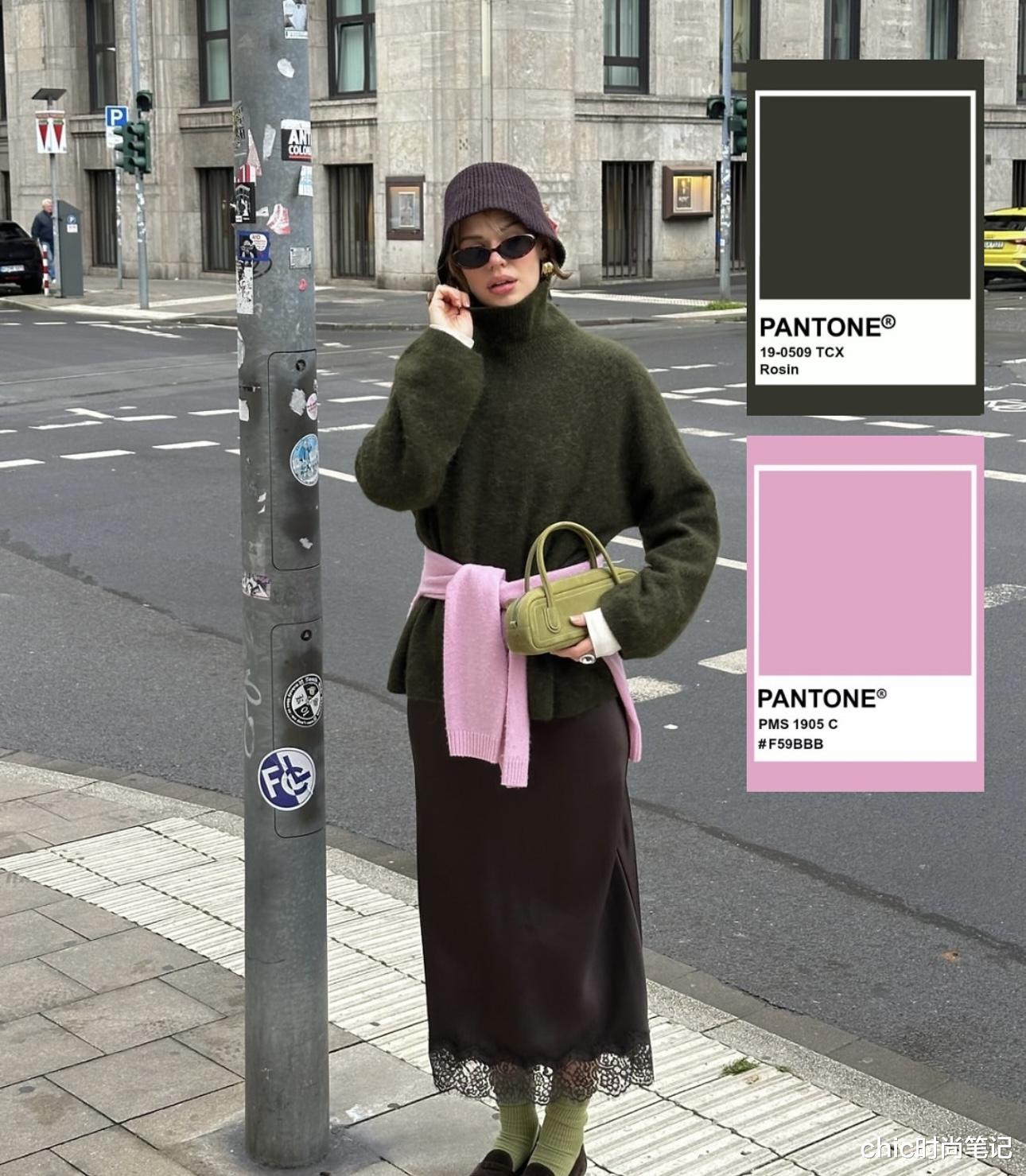 秋冬季节,穿搭当然也是符合季节性的。墨绿色高领毛衣搭配棕色缎面半身长裙,长裙上的蕾丝点缀精致且优雅,用粉色针织衫作为腰间配饰,眼前一亮。