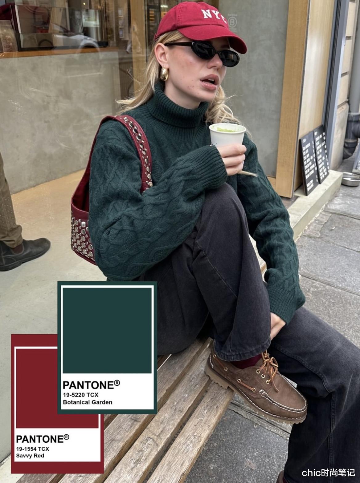 圣诞色系的经典配色,酒红色和墨绿色,一般是毛衣、针织衫为主,或者是配饰的包包、帽子。