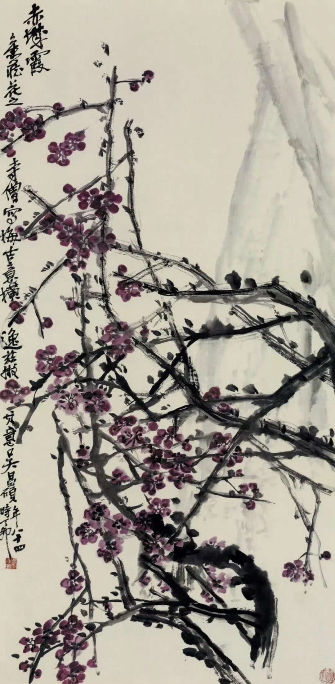 看他画梅,枝干用的是"屋漏痕"的笔法。笔锋饱蘸浓墨,往下一拖,中途稍一停顿,再猛一发力,枝干的节疤就出来了,像老树皮被岁月凿出的痕。这哪是画枝?是把写隶书的"蚕头燕尾"化进了笔墨,起笔藏锋如蚕头,收笔重按如燕尾,连墨色的浓淡变化,都和书法的"提按顿挫"严丝合缝。