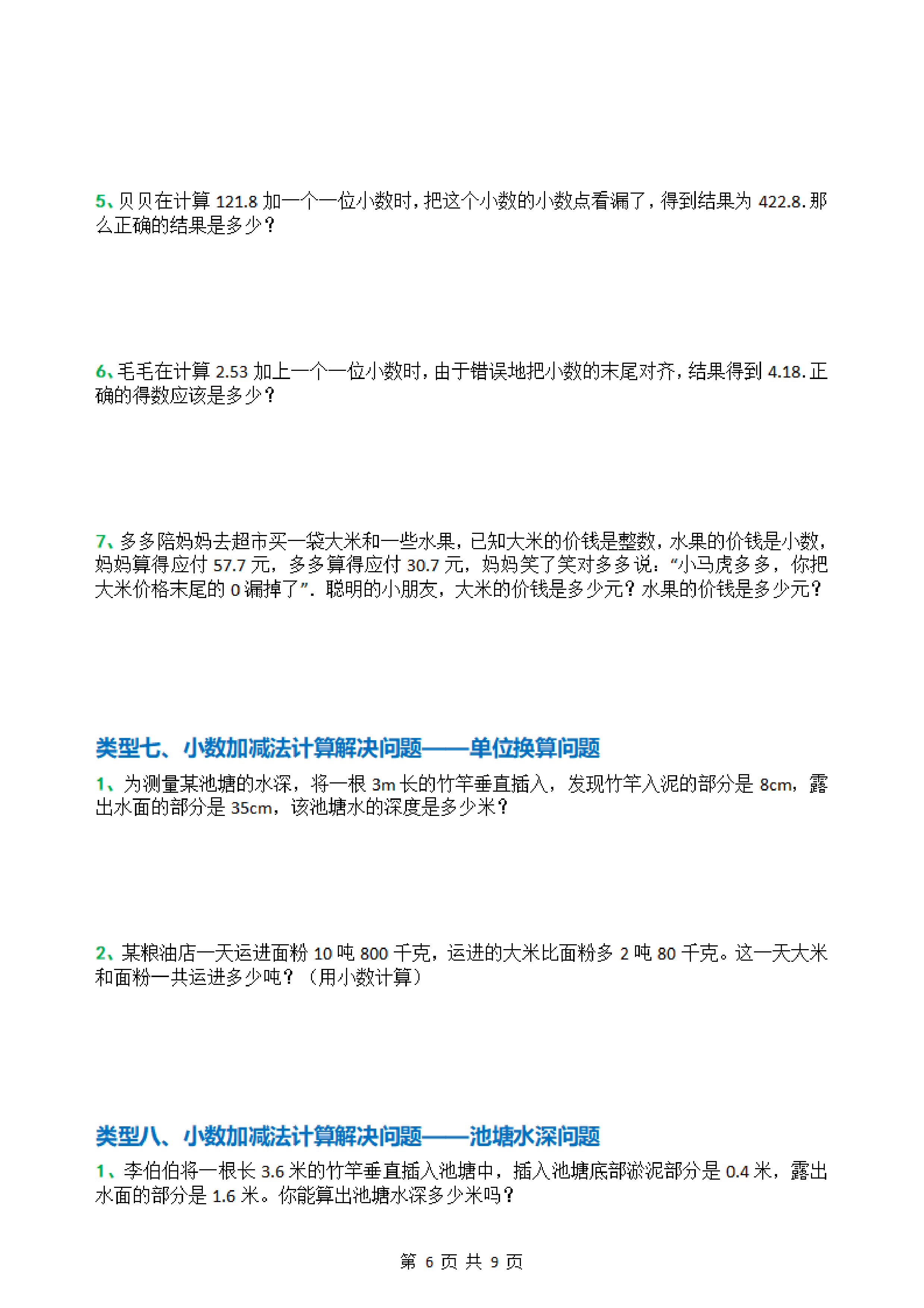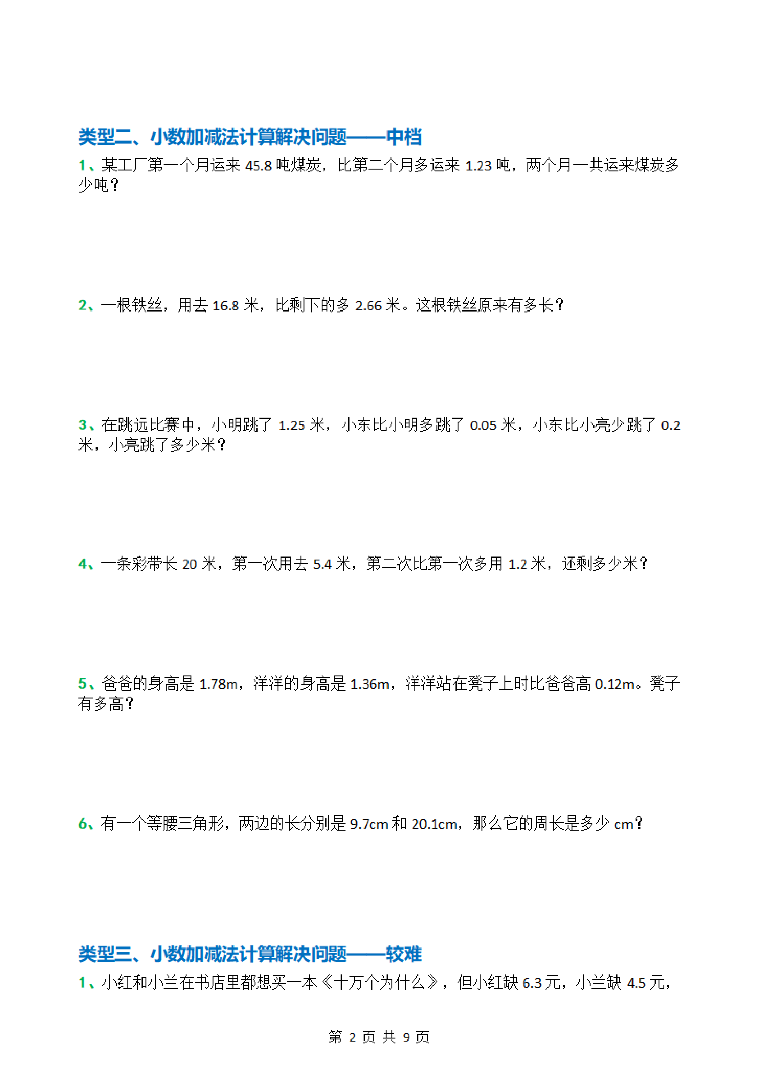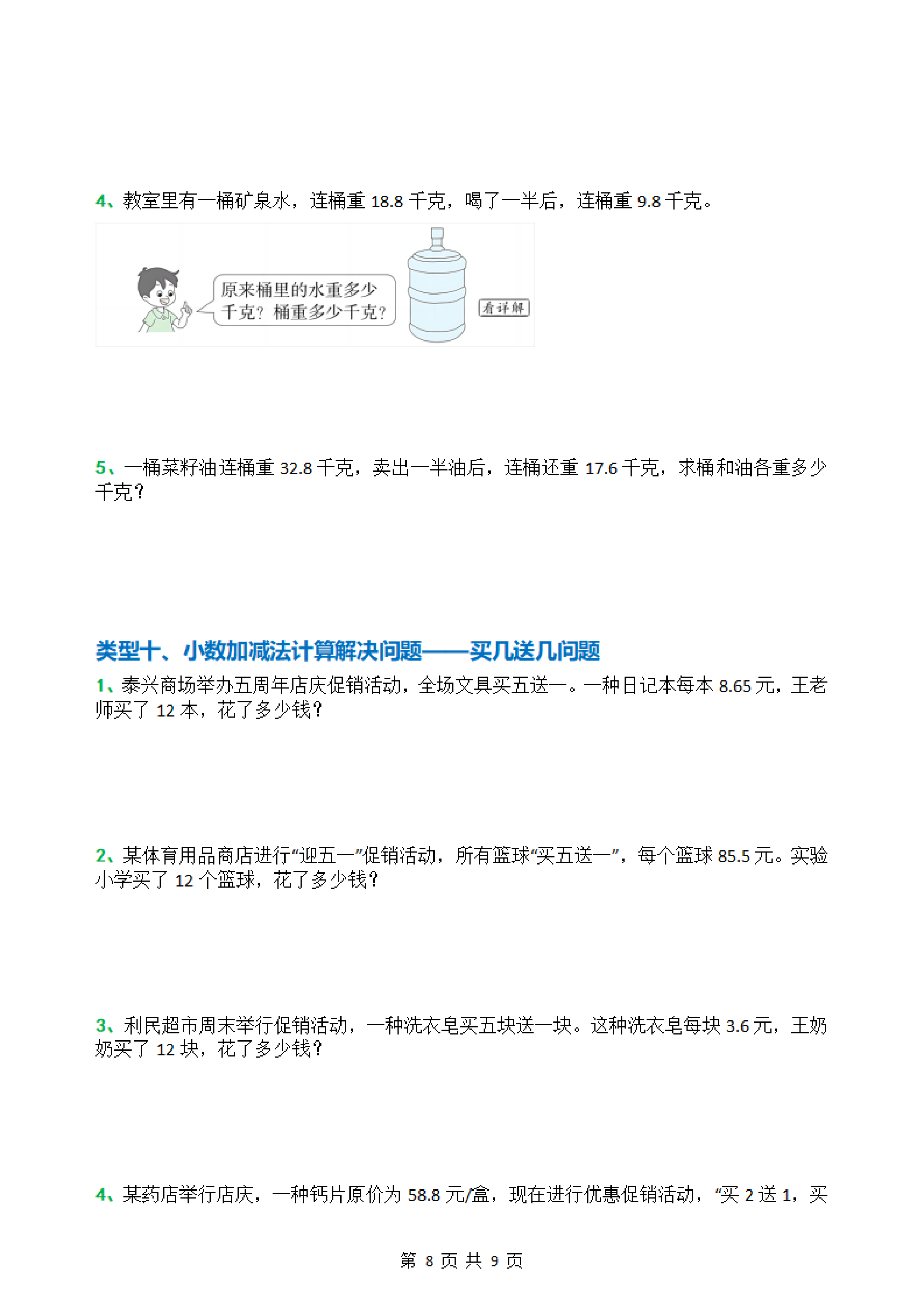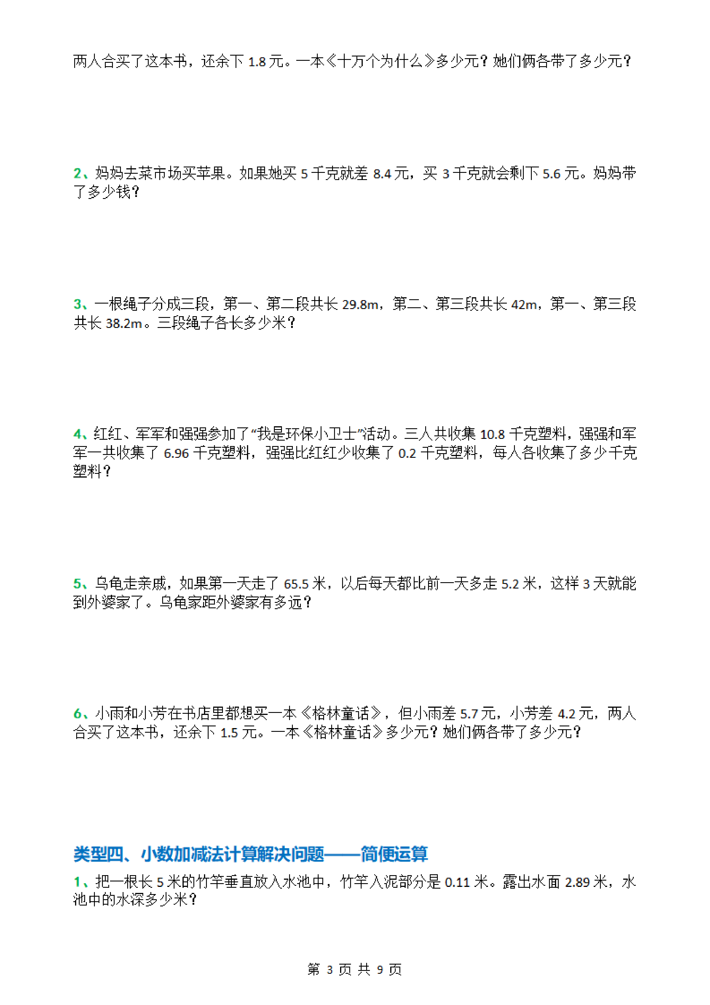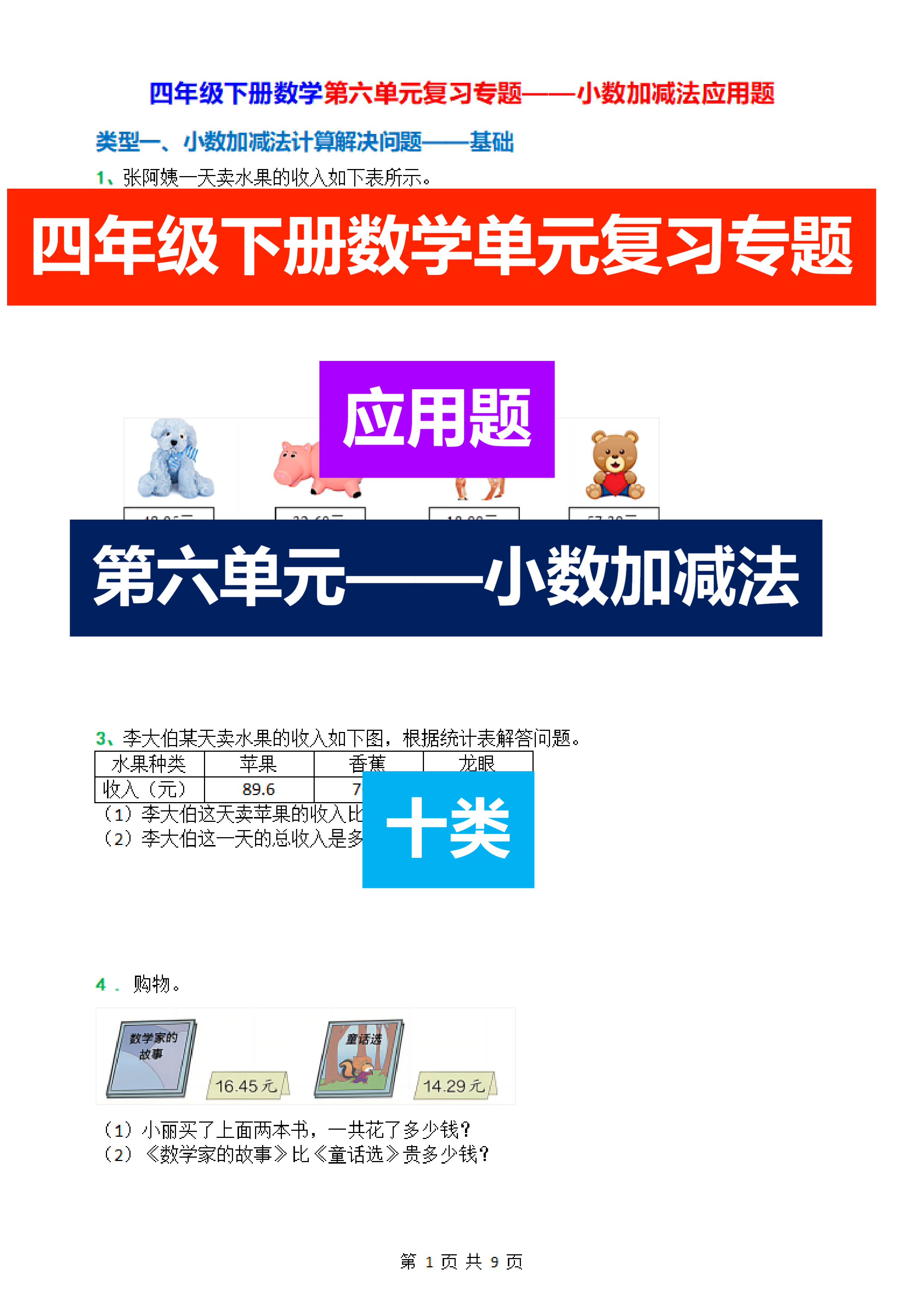 四年级下册数学第六单元复习专题——小数加减法应用题
