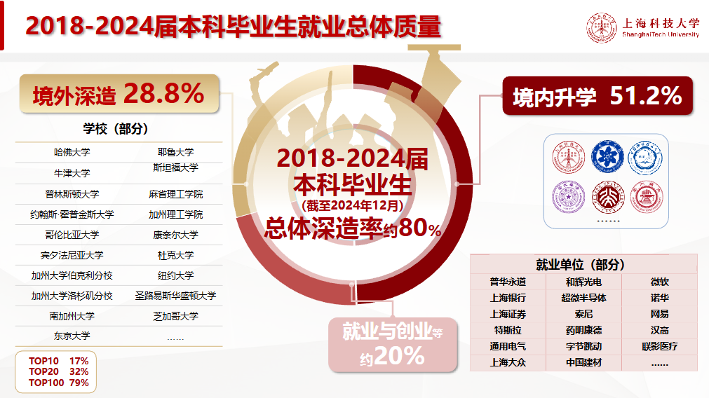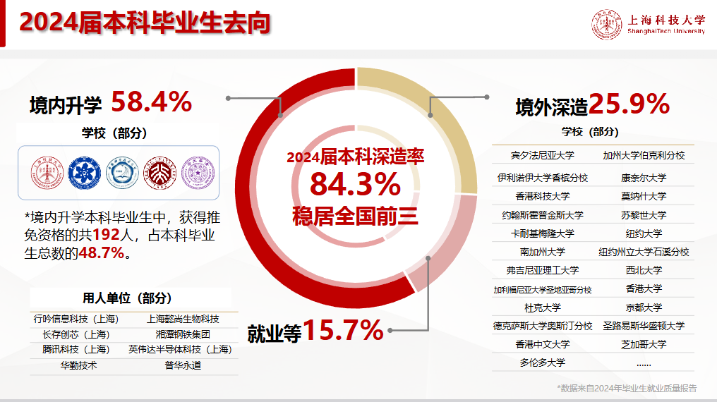 上海科技大学2024届本科毕业生以境内升学和境外深造为主要毕业去向,境内外深造率达84.3%。境内升学本科毕业生中,获得推免资格的共192人,占本科毕业生总数的48.7%,占境内升学人数的83.5%。2024届本科毕业生中,有102人前往境外高校攻读研究生,占本科毕业生总数的25.9%。境外深造的本科毕业生,拿到多所世界知名大学录取通知书。