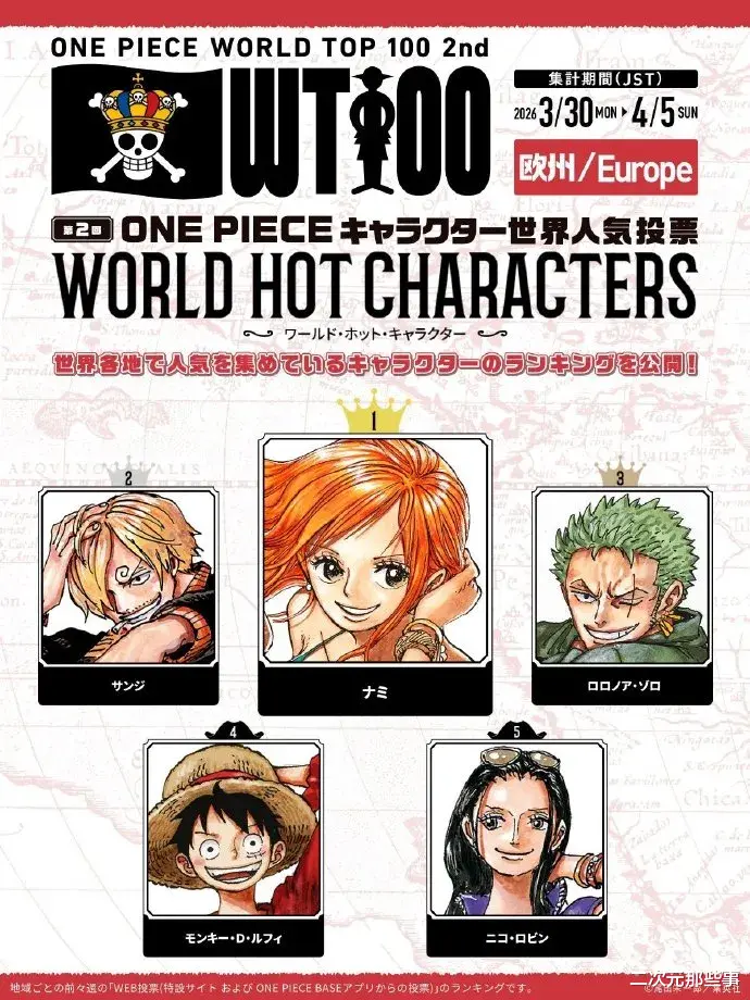 欧洲地区:第一名:娜美 第二名:山治 第三名:索隆 第四名:路飞 第五名:罗宾