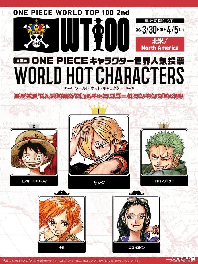 北美地区:第一名:山治 第二名:路飞 第三名:索隆 第四名:娜美 第五名:罗宾