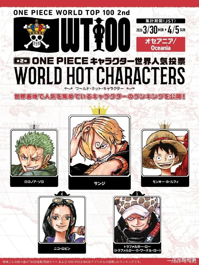大洋洲地区:第一名:山治 第二名:索隆 第三名:路飞 第四名:罗宾 第五名:罗