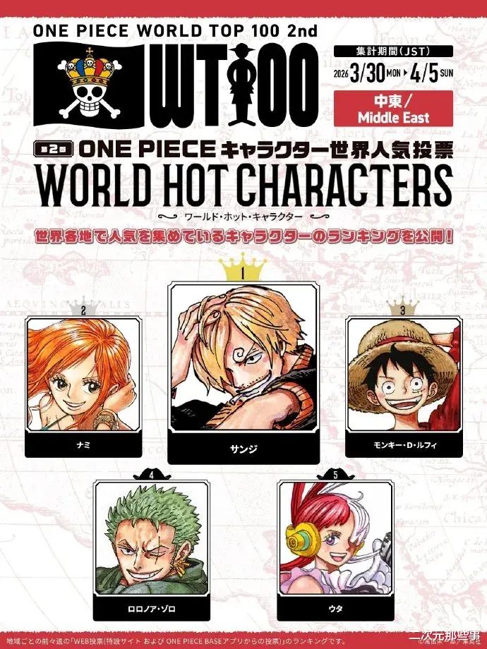 中东地区:第一名:山治 第二名:娜美 第三名:路飞 第四名:索隆 第五名:乌塔
