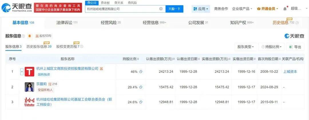 目前,杭州娃哈哈集团有限公司由杭州上城区文商旅投资控股集团有限公司、宗馥莉、杭州娃哈哈集团有限公司基层工会联合委员会(职工持股会)共同持股,其中宗馥莉持股29.4%,为第二大股东。