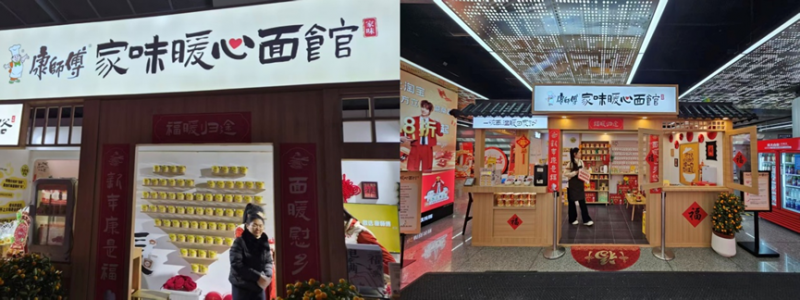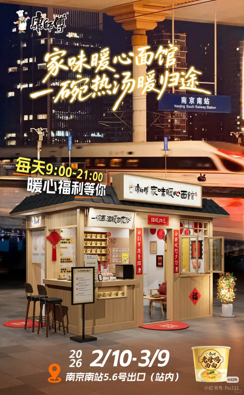 春运期间,康师傅在全国二十五座城市的交通枢纽开设了“家味暖心面馆”。从北方的风雪车站到南方的绵绵雨夜,一盏盏暖黄的灯光,为归心似箭的游子留灯、温汤。