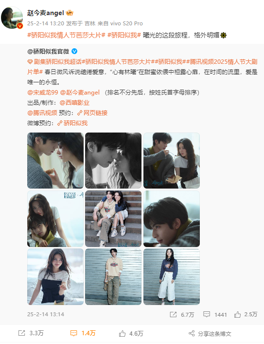 2月14日,赵今麦与宋威龙携手发布了一组甜蜜的写真剧照,配文“曦光的这段旅程,格外明媚”,让无数粉丝为之沸腾。两人在电视剧《骄阳似我》中饰演的“聂曦光”和“林屿森”凭借深厚的感情基础和多次亲密戏份,深受观众喜爱,而此次的合照也让大家再次见识到他们的自然默契与甜蜜互动。在这组写真中,赵今麦和宋威龙通过时尚与情感的双重表达,不仅撒了一波“糖”,更将他们这对银幕CP的魅力展现得淋漓尽致。