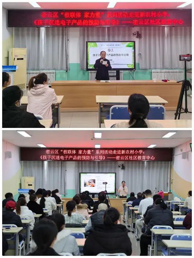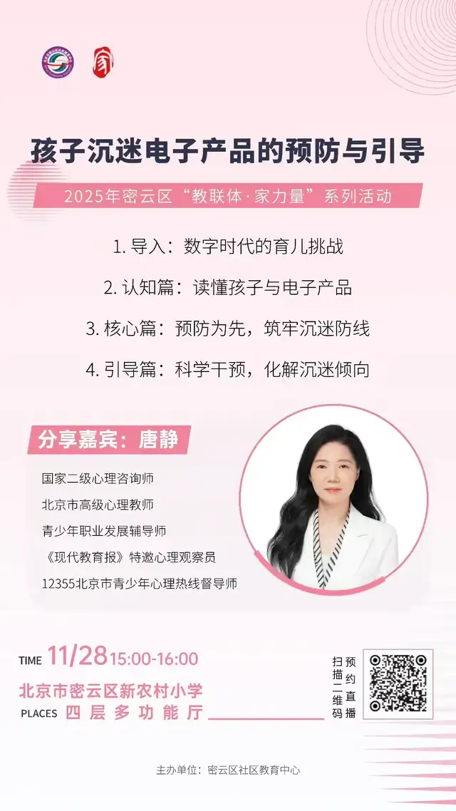 11月28日,第五场线下系列讲座——《孩子沉迷电子产品的预防与引导》在密云区新农村小学成功举办,旨在为家长提供应对数字时代育儿挑战的实用策略。本场讲座由新农村小学副校长冯元广进行开篇讲话,他穿针引线,在专家与家长之间架起沟通桥梁,极大提升了讲座的共鸣与实效。随后,国家二级心理咨询师、北京市高级心理教师唐静担任主讲,凭借其在青少年心理辅导领域的丰富经验,为家长们带来了一场结构清晰、内容扎实的专题讲座。