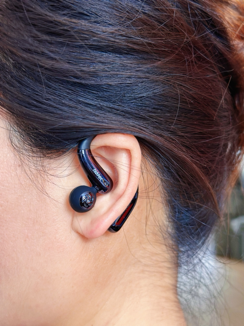 独特造型: 耳挂+涡轮式喇叭单元的造型辨识度极高。外侧的亮面设计增添了一丝精致感,佩戴时更像一个科技感饰品。