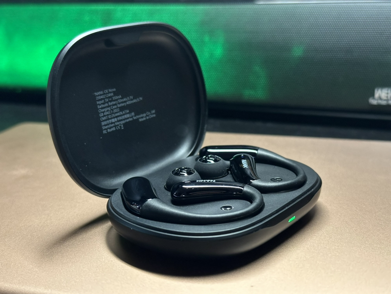 OE Nova的包装走的是淡雅路线,灰色调+产品渲染图,背面信息清晰。我手上的是经典黑色款(另有卡其色可选)。最大的惊喜是充电仓设计深得我心!扁圆造型,正面简洁的NANK Logo,侧面是电量指示灯。重点来了:整仓仅重约58克! 这体积和重量,揣兜里几乎无感,通勤、差旅携带零负担。