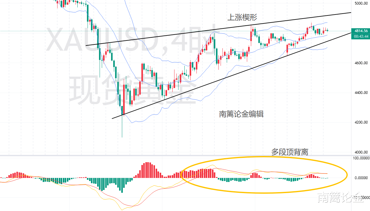 短线上:金价整体维持在上涨楔形内,此处排除掉了前一根4099拔起来的长下影线。此时行情高低点不断上抬,布林带开口向上,每次回调到支撑区域都能快速企稳回升,买盘承接力度较强。目前 4 小时级别呈现横盘走势,短线黄金进入整理状态。同时,该时间区域为多段顶背离的构建中,两种调整,直接调整或者以时间换空间。