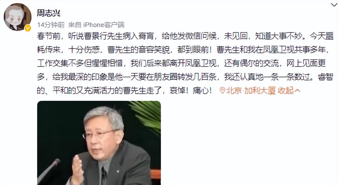 凤凰卫视主持人曹景行去世,临终前四天狂发朋友圈