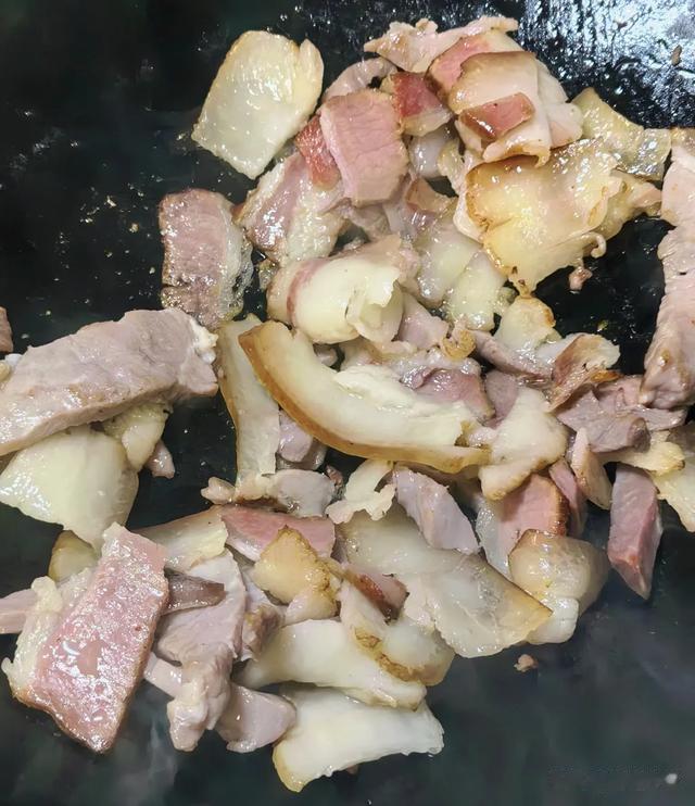 起锅,开火,倒入腊肉煸炒出油,握着锅铲在铁锅里翻炒腊味儿,猪油冒出来了,腊肉的香味也散发出来。腊肉和洋葱搭配,和土豆搭配、和菜苔搭配、和上海青搭配,和竹笋搭配,和蒜薹搭配,或是和花菜等搭配,配啥啥香。