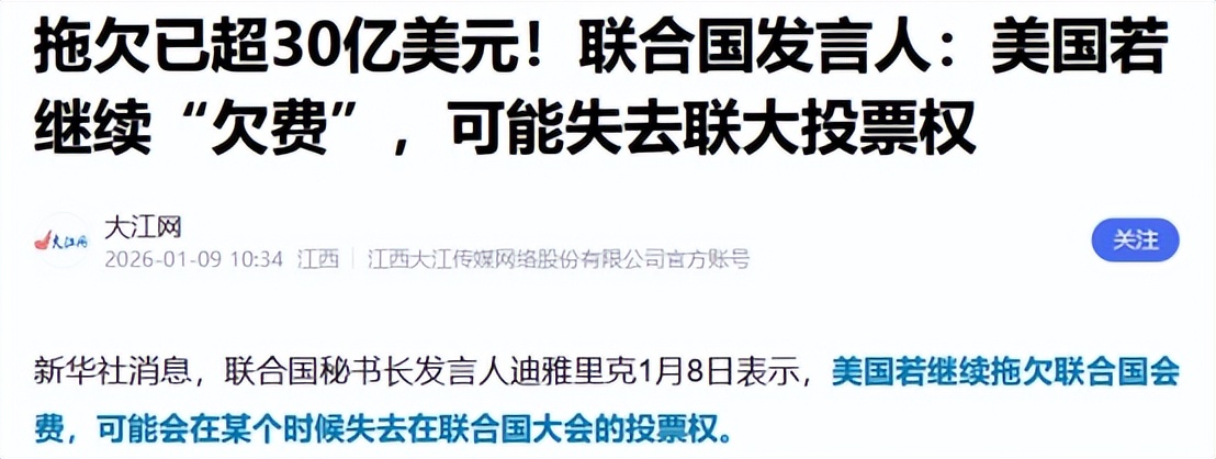 对于这种长期欠账的行为,联合国终于不打算忍了,1月8日发言人迪雅里克把话挑明了,如果美国继续这么拖着不给钱,那就得按规矩办事,可能失去投票权。