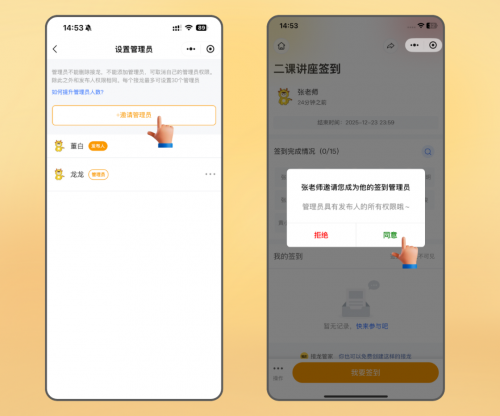 使用接龙管家发布签到接龙,可以设置多个管理员,不仅发布人可以查看,管理员可同步查看单个成员的签到数据、签到进度,并进行导出数据等操作。
