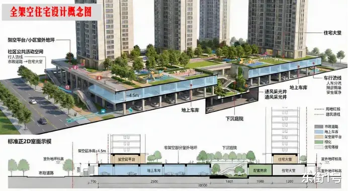 “抬板住宅”官方的定义是,通过将居住层整体抬高约4-12米,利用底层架空空间构建"人车分流+立体景观+复合公共空间"立体分层结构的高品质住宅社区。