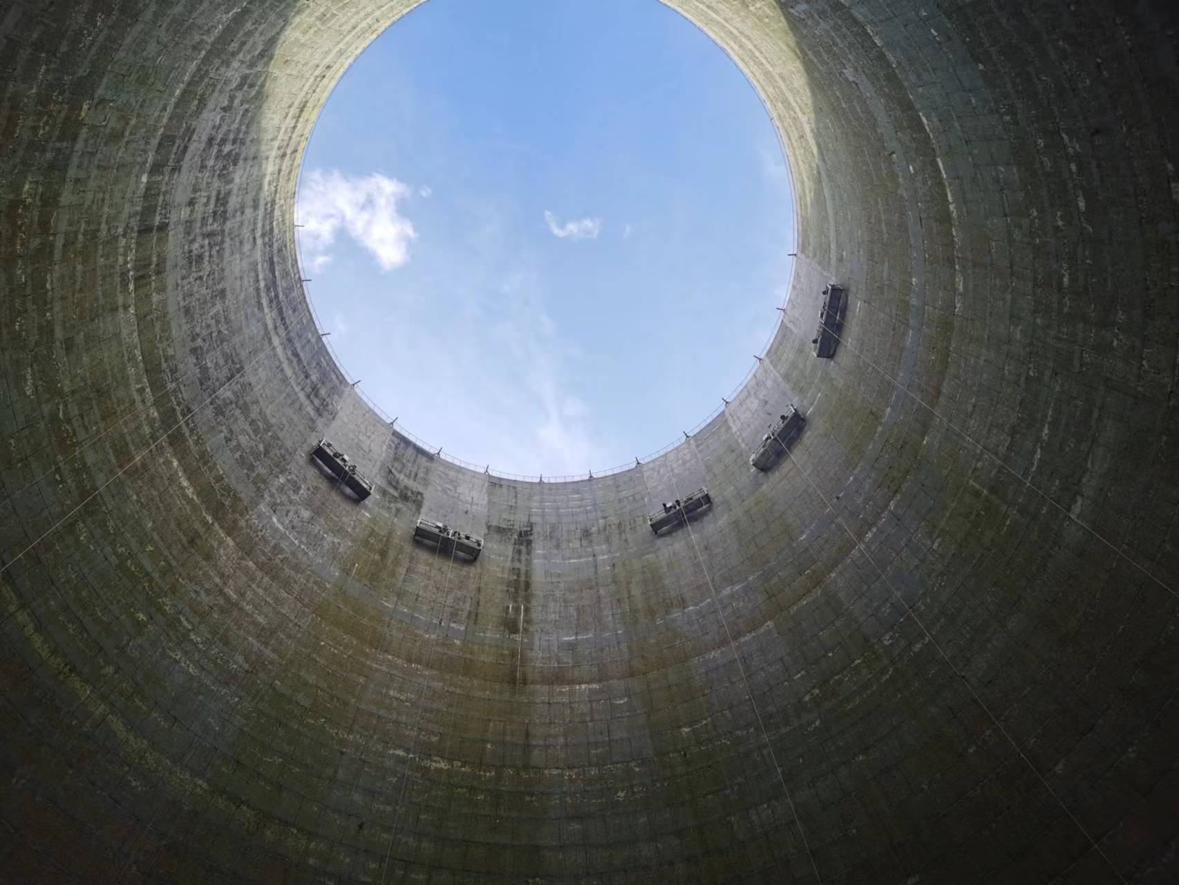 2.搭建带防坠器的高空作业吊篮,与塔壁间距控制在 30-50cm;