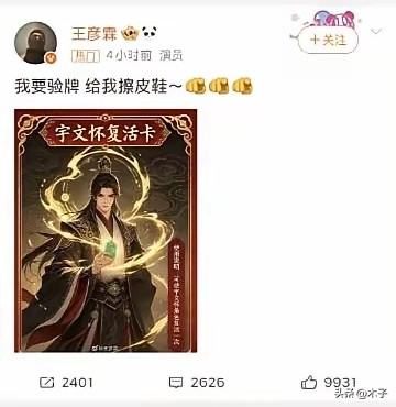 紧接着,他更是直接发布微博,配文“我要验牌 给我擦皮鞋~”,还附上了一张“宇文怀复活卡”的海报,直接把当年的经典名场面焊死在了热搜上。