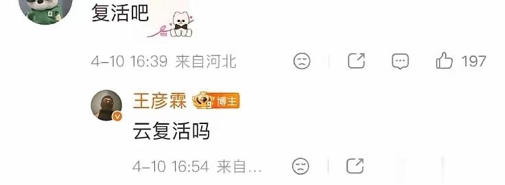 王彦霖直接在线接梗,回复了一句灵魂拷问:“云复活吗”,瞬间把网友的回忆拉回了九年前。
