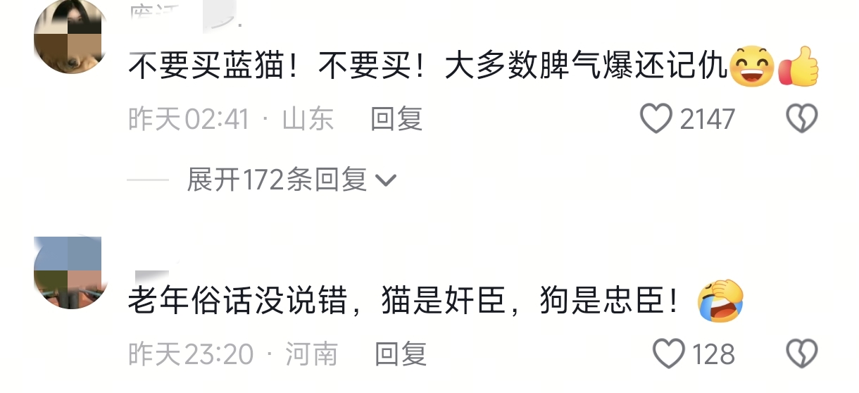 此事引发众多网友共鸣。有人直言:“养久了就知道,猫觉得它是主人,你得伺候好,不然它就发飙记仇。狗才是把你当主人。”更有过来人劝诫:“别养蓝猫!大多数脾气爆还记仇。”