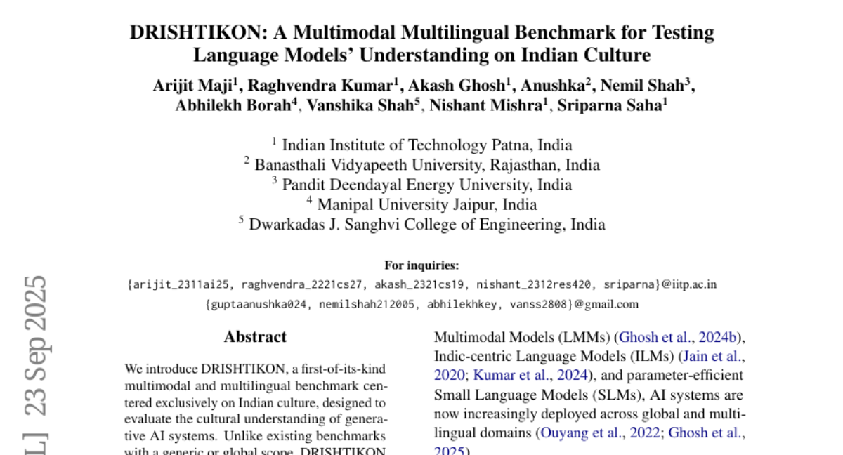 这项由印度理工学院巴特那分校的Arijit Maji和Sriparna Saha教授团队主导的研究发表于2025年1月,研究成果被收录在计算语言学顶级会议中。这个名为DRISHTIKON的研究项目首次创建了专门针对印度文化的大规模多模态多语言AI测试基准,有兴趣深入了解的读者可以通过论文编号arXiv:2509.19274v1查询完整论文。