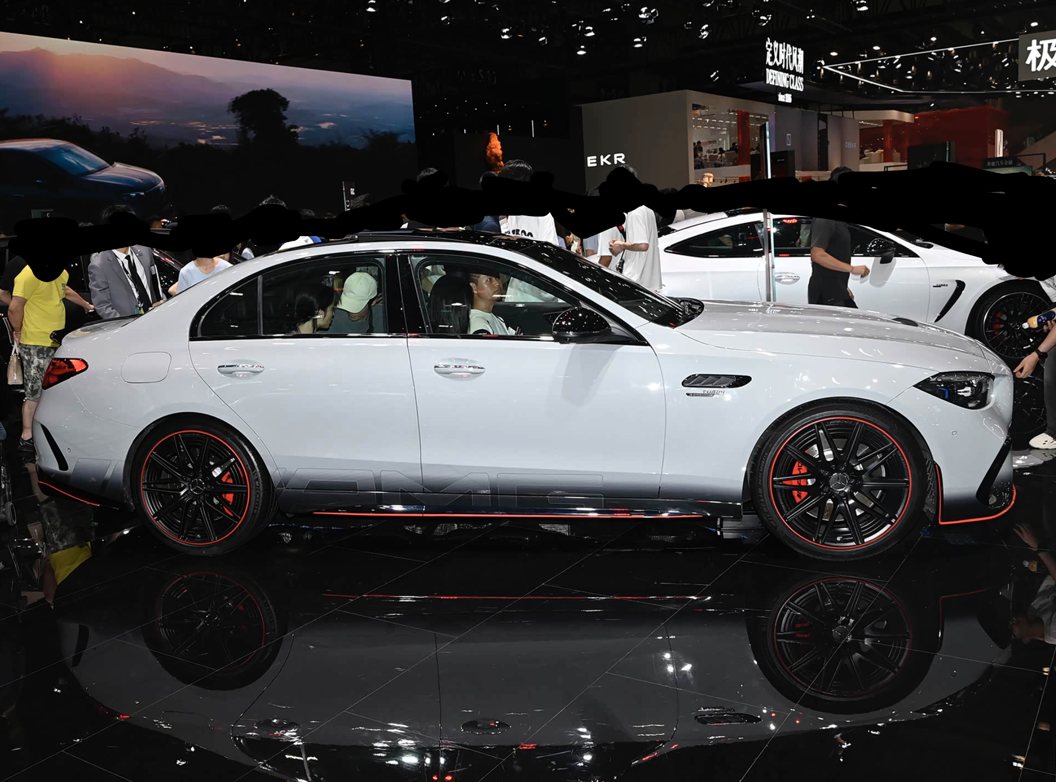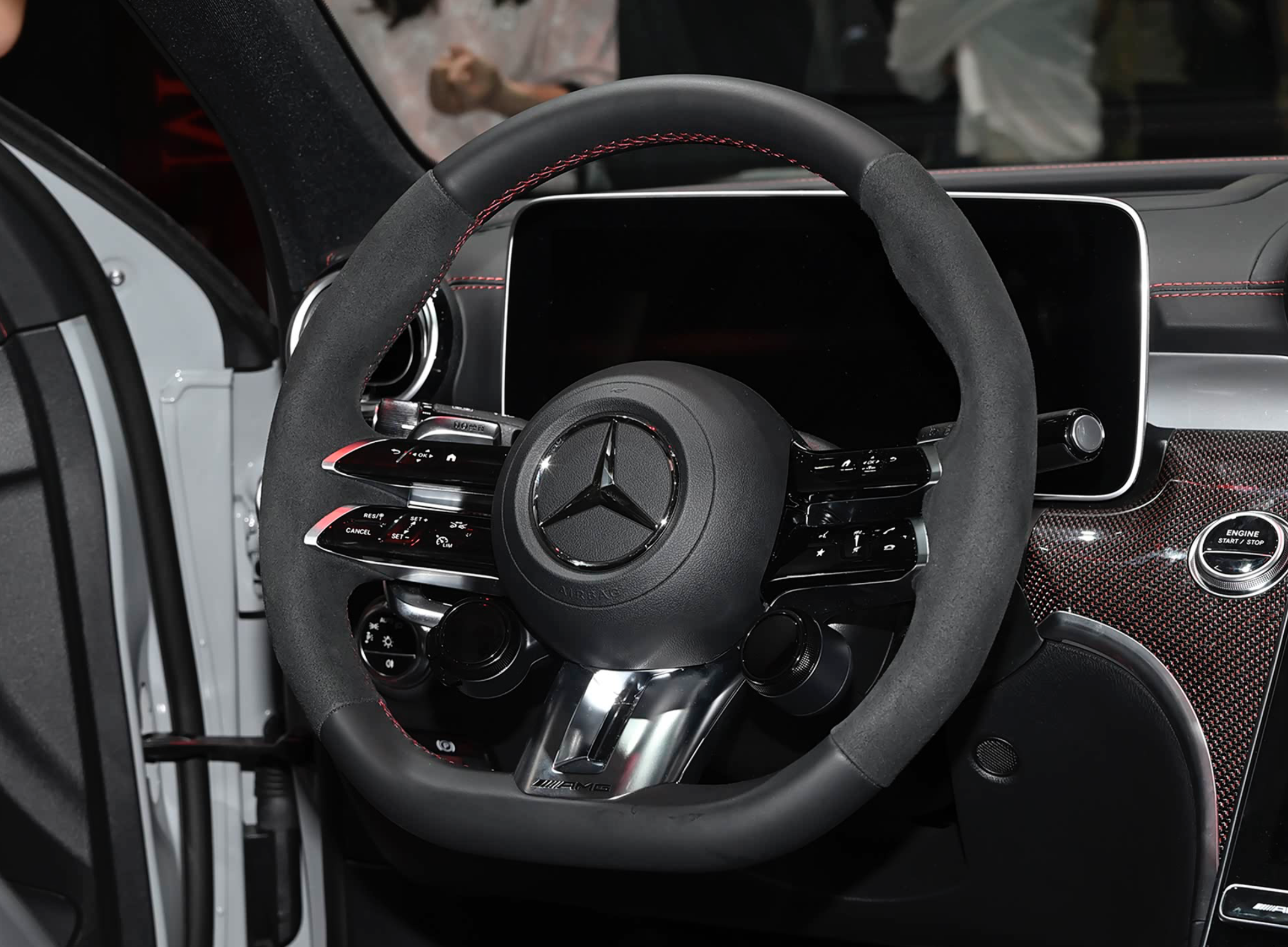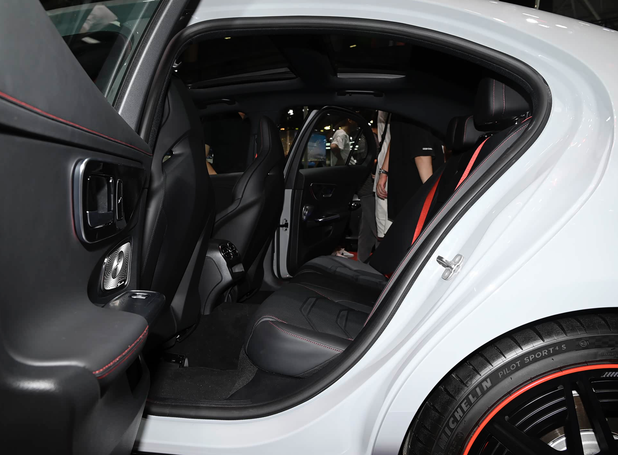 进入车内,梅赛德斯奔驰AMG C 63采用了大面积灰色Alcantara面料的包裹,并配有大量红色真皮皮革的点缀,还融入了碳纤维装饰板和很多圆形元素的加持,前排配备了两个桶装赛车座椅,提供了更好的包裹和支撑性,还可以选择四点式安全带。中控台像老大哥奔驰S63 L E Performance看齐。配备了12.3英寸的LCD全液晶仪表和12.8英寸的中控液晶大屏,仪表盘支持裸眼3D效果,搭配着HUD抬头显示屏还自带AR增强现实功能,效果酷炫。中控屏采用了OLED技术,分辨率为1888×1728,带有振动反馈,进入了全新的数字化时代。