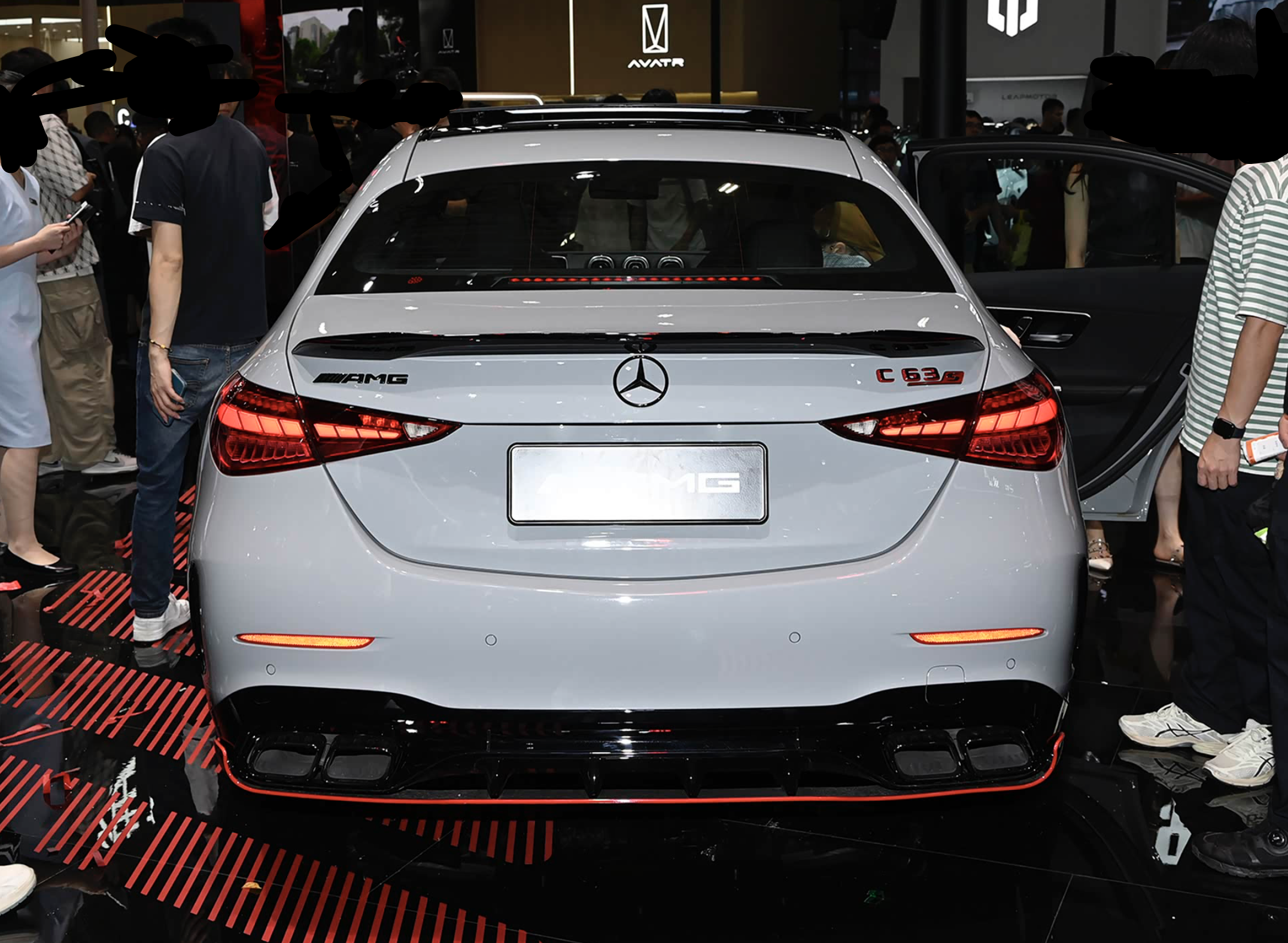 颜值方面,新一代梅赛德斯奔驰AMG C 63采用了AMG家族式的大嘴式格栅,配备了直瀑式的银色中网和硕大的奔驰银质车标,两侧造型造型更加尖锐、犀利,还加入了黑色的装饰边框,内部融入了梅赛德斯最新研发的数字式矩阵式大灯。车尾的造型与时俱进,终于换上了贯穿式的尾灯,黑色的灯罩,内部融入了流光溢彩式的可变化光带,不仅可以自定义灯光动画,还能与驾驶模式联动,开灯的仪式感惊艳了所有人。全车配备了最新设计的AMG运动包围。前舱盖加入了隆起的筋线,前包围采用了左右对称式的大尺寸圆润导流槽,中间的梯形进气口也变得更加圆润,大量黑色碳纤维材质的装饰,再配上纤薄的前铲和红色的装饰条点缀,极具侵略性。车尾配备的小尺寸尾翼和夸张的底部扩散器都采用了黑色碳纤维材质,也同样加入了红色的饰条点缀,双边四出的炮筒式排气也重磅回归,运动感很强。