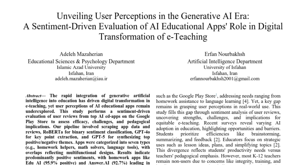 这项由伊斯法罕伊斯兰阿扎德大学教育科学与心理学系的阿德莱·马扎赫里安博士和伊斯法罕大学人工智能系的埃尔凡·诺尔巴赫什共同完成的研究,于2025年发表在一份关于生成式人工智能在教育领域应用的重要学术期刊上。有兴趣深入了解技术细节的读者可以通过论文标题"Unveiling User Perceptions in the Generative AI Era: A Sentiment-Driven Evaluation of AI Educational Apps' Role in Digital Transformation of e-Teaching"查询完整论文内容。
