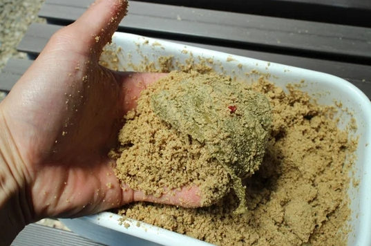把混合好的香精和色素均匀地撒在混合好的颗粒粉和膨化大豆粉上,然后用手或者勺子搅拌均匀,让每一粒粉都沾上香精和色素,这样你的小黄面就制作好了,你可以把它放在一个密封的容器里,保存起来,等到钓鱼的时候再用。