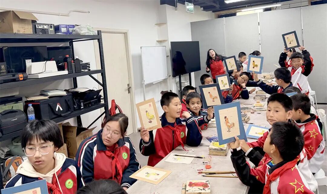 “你看,这样轻轻转动工具按压,图案就清晰多啦!”“上色的时候要顺着木纹涂,颜料才会更均匀。”小组内的互助声、讨论声此起彼伏。经过反复尝试,同学们逐渐掌握了技巧,当一张张带着墨香的木版水印作品被轻轻揭开时,现场响起了阵阵欢呼。有的同学印出了灵动的小蛇,有的同学收获了神气的公鸡,每一幅作品都独一无二,承载着大家的专注与创意。同学们小心翼翼地捧着自己的作品,脸上洋溢着满满的成就感,还互相展示、分享创作心得,将传统工艺的魅力深深印刻在心中。