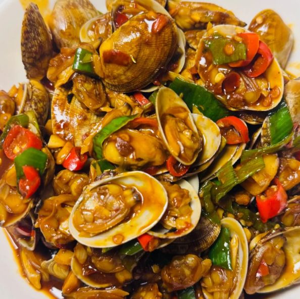热锅倒油,油温上来后先把姜蒜爆香,接着下干辣椒、花椒和青花椒,火不能太大,免得把辣椒炒糊。等香味呛出来,把焯过水的花甲倒进去,开最大的火快速翻炒,让每一颗花甲都沾上锅里的香料。这个时候沿锅边烹入一圈料酒,滋啦一声,酒香裹着辣味直往鼻子里钻。最后淋入调好的料汁,撒一把葱段和香菜,再大火翻炒几下,等汤汁变得浓稠透亮,全部均匀地挂在花甲壳上,就可以出锅了。