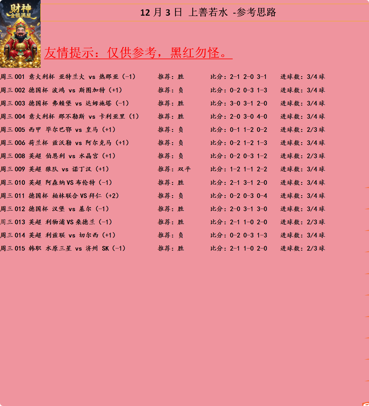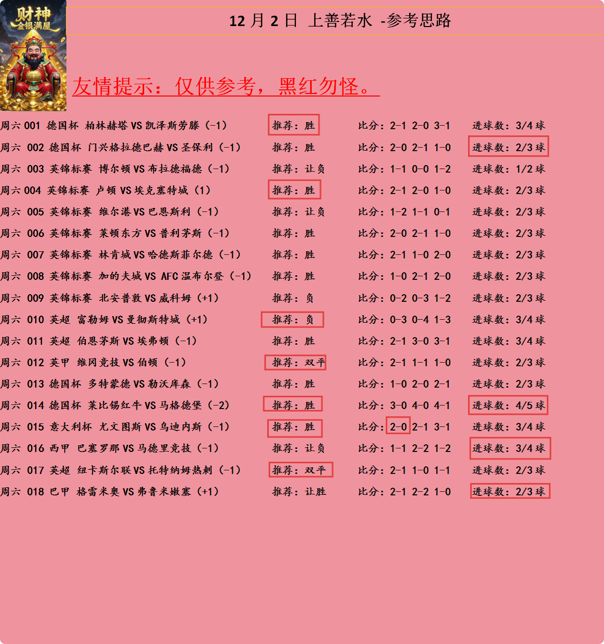 大家好,我是上善若水 -参考思路扫盘分析师,作为一名在足球领域沉浮多年来的老玩家。首先要声明的是我们并不会刻意宣传自己,因为这并不重要,我们关注的点在于比赛本身与让人着迷的数据分析。如果我们的分析可以让更多的朋友看到,那将是我们的荣幸。立足基本面和数据分析,大胆判断、稳中求胜、力求实效。以下是我个人的见解,供大家参考,最后祝各位事事顺心,一路长虹!!!