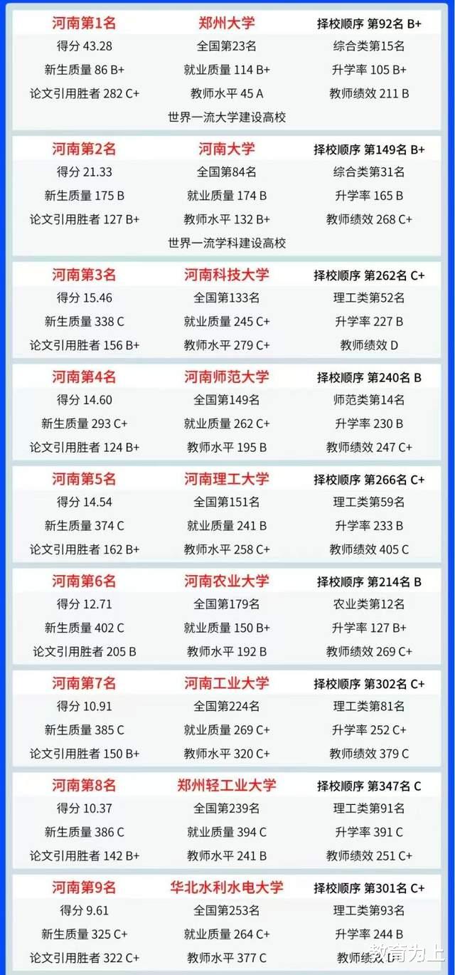 在这份榜单中,基于新生质量、就业质量、升学率等指标进行量化评比,共计36所本科大学上榜,上榜高校既包括河南省仅有的两所“双一流”大学的郑州大学、河南大学,也包括河南省区域重点大学的信阳农林学院、南阳理工学院等。