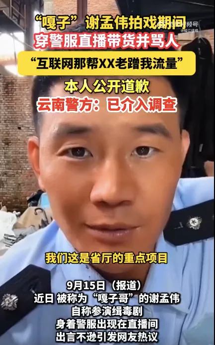 2025年9月10日,谢孟伟在云南拍摄电影休息期间,身着带有警用肩章、臂章的制式警服进行直播带货(推销充电宝与随身WiFi设备),并声称“穿警服需政审”“公安需配合他”。