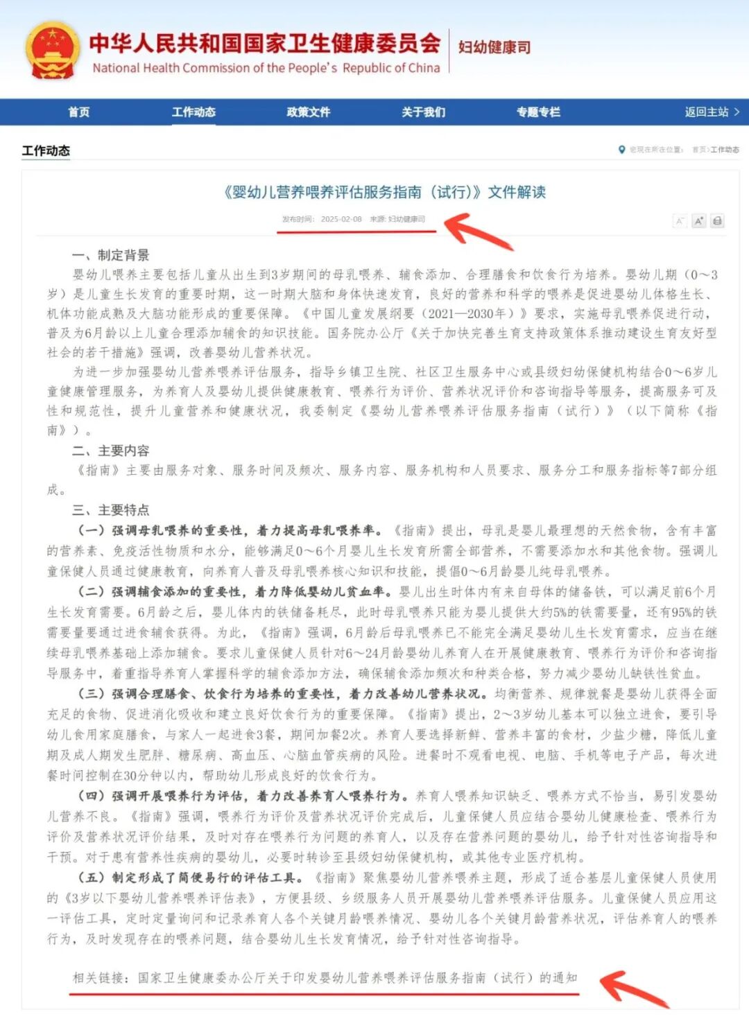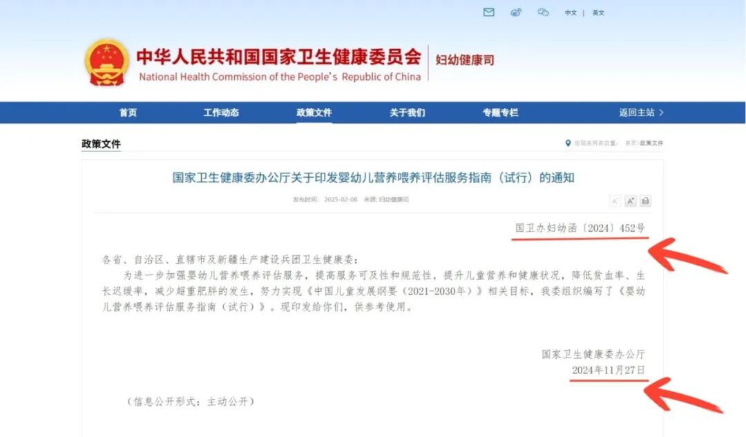 2025年2月8日国家卫健委妇幼保健司发布了一份工作动态:《婴幼儿营养喂养评估服务指南(试行)》文件解读,对《婴幼儿营养喂养评估服务指南(试行)》进行了解读,在这份工作动态的文末,附上了相关链接:国家卫生健康委办公厅关于印发婴幼儿营养喂养评估服务指南(试行)的通知