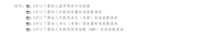 打开上述链接后,是国家卫健委办公厅发布的文件《国家卫生健康委办公厅关于印发婴幼儿营养喂养评估服务指南(试行)的通知》(国卫办妇幼函〔2024〕452号),在《婴幼儿营养喂养评估服务指南(试行)》文末中有《3岁以下婴幼儿年龄别身长(身高)标准差数值表》等附件,